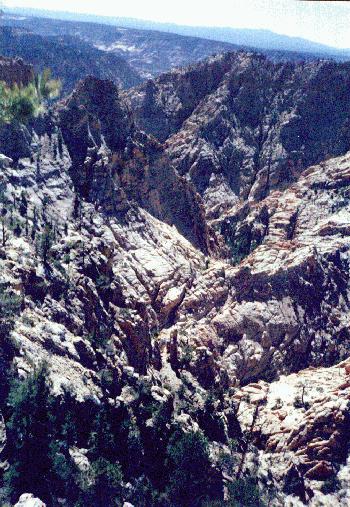 Death Hollow - a view down Death Hollow toward the lower Escalante Basin; the Straight Cliffs are visible in the distance. |