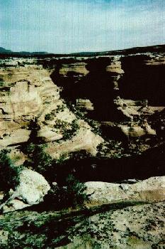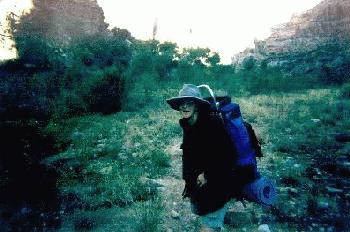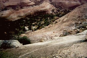 This is a view down the slickrock trail that leads out of Fish Creek Canyon, from about 3/4's of the way up. The trail climbs 800 feet over a quarter mile of distance. The last 30 feet is a vertical climb up a narrow crack in the stone, and would have been greatly facilitated if we'd had a rope for drawing the packs up after us. We improvised. |