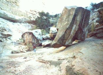 Boulder Fall in Kane Gulch - this house-sized boulder is one of many that have peeled off of the canyon walls over the centuries. Louise is standing to the left of the boulder - which should give you some vague notion as to the scale of the thing. |
