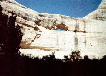 Grand Arch - this arch is located nine miles below Collins Canyon, and is roughly 150 feet in width. Unlike Stimper Arch, it is located near the canyon floor, jutting into the bend of a meander. It resembles a natural bridge more than it does an arch, save that the stream bed does not cut beneath it. Several interesting petroglyphs and pictographs can be found on this formation. |