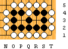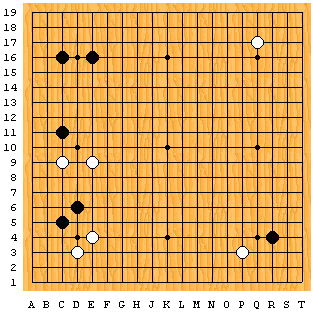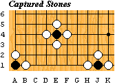A player may pass his turn instead of placing a stone. This will not normally happen until the end of the game, when there are no more profitable plays to be made. When three consecutive passes have been made, the game is over, and the players begin scoring. The players begin by removing all of the dead stones from the board, then by filling the opponent's vacant spaces with captured stones. It doesn't matter where these stones are placed within enemy territory, as new captures cannot be made while scoring. All neutral points are then filled in. The players then count the remaining vacant spaces, and compare the tallies. The highest score wins. The diagram at the left shows a final position. In this case, seeing that he was lost, the white player had resigned the game before all of the frontiers between the opposing groups had been filled in. If the game had continued to its conlusion, and the score tallied, black would have won the game by a margin of about 11 points (black had captured and removed five stones during the game, while white had captured and removed 2).