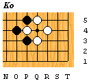 A repeating position, called a ko, is possible during play. In the diagram, the stones are interlocked in such a way as to make perpetual captures possible. Black plays at q4, capturing the stone at p4. In this position, to avoid perpetual captures, white is required to play a move elsewhere before playing at p4. This gives black the opportunity, if he wishes, to fill the point at p4 before white's next turn. If he does not, and white plays p4 on his next available move, then black must play elsewhere before playing again at q4. Each player may attempt to force his opponent to play elsewhere on the board by making threats, so that the opponent must respond to the threat rather than filling the ko. This is what is known as a "ko fight." If there are three ko positions on the board, the game is considered drawn.