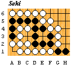 Groups of stones may also become interlocked in such a way as to cause an impasse, in which neither player can gain advantage. This situation, called seki, is illustrated by the figure to the right. Neither player can place at c3 without losing his own group by the opposing player's next placement. The vacant point (or points) between the groups are considered neutral, and are credited to neither player.