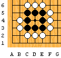 Players are seated on the floor, facing each other across the empty board. Black plays first, placing a stone at the intersection of one of the points of the grid, followed by white. The players alternate their placement of the stones. Once a stone is placed, it is not moved, although it can be captured. The diagram at the right shows a game in progress following white's 6th placement.