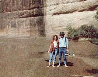 This is a photo of Louise and me in Chinle Wash. We are at the bottom of the White House Ruin trail in Canyon de Chelly. Note the cross-bedding in the rock strata of the cliff behind us. This structure is the basis of the idea that the sandstone was deposited as wind-blown dunes during the middle of the Permian age. |