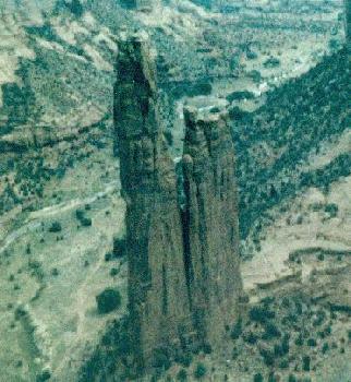Spider Rock - so named after the legend of Spider Woman, who is credited with endowing the Navajo people with the craft of weaving. Spider Rock is roughly 800 feet high. Some sense of the scale involved can be obtained from the jeep trail to the left of the spire. |