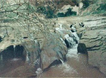 Coyote Gulch - The stream bed, especially near the most active springs, is intricately carved in many places into miniature chutes, flumes, and races. |