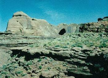 Skyline Arch - This can best be seen from the top of a sandy side-trail, at the confluence of Coyote Gulch with the Escalante River. It is marked on the maps as Stevens Arch; however, I usually prefer the older, more descriptive names. |