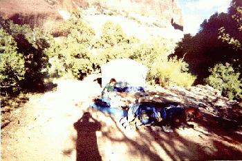 This is a view down the slickrock trail that leads out of Fish Creek Canyon, from about 3/4's of the way up. The trail climbs 800 feet over a quarter mile of distance. The last 30 feet is a vertical climb up a narrow crack in the stone, and would have been greatly facilitated if we'd had a rope for drawing the packs up after us. We improvised. |