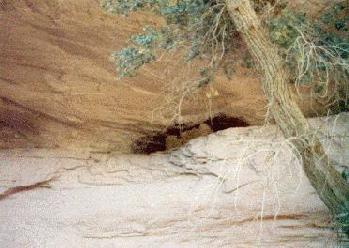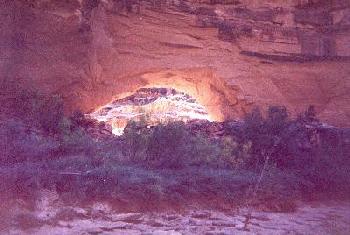 Grand Arch - this arch is located nine miles below Collins Canyon, and is roughly 150 feet in width. Unlike Stimper Arch, it is located near the canyon floor, jutting into the bend of a meander. It resembles a natural bridge more than it does an arch, save that the stream bed does not cut beneath it. Several interesting petroglyphs and pictographs can be found on this formation. |