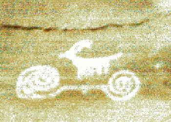 Petrograffiti - wherever Anasazi ruins are found, so also are found the various figures with which they adorned the canyon walls. This petroglyph seems to represent a bighorn sheep, above a curious double spiral. Spiral motifs figure prominently in Anasazi rock art. |