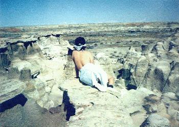The Bisti - Louise catches some rays among the fantastically eroded "hoodoos" of the Bisti Wilderness. This area is located in northwestern New Mexico, close to the Arizona Border. Bisti is a Navajo word that means "badlands". The area also features lots of petrified wood. |