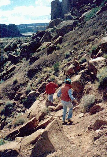 Jenn and me ignoring the magnificent butte behind us in favor of a little clump of broom snakeweed growing in the sand. Such is the inherent perversity of the human animal. Of two of them, anyway. |
