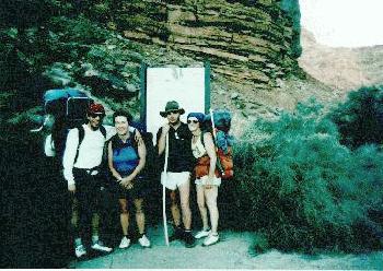 End of the Trail - from the left: our friends Jorge and Liz, then me and Louise. We picked up Liz's car here and drove back up to the trailhead to get ours. The trail ends at the former site of Lee's Ferry, where many of the Grand Canyon rafting trips begin. |