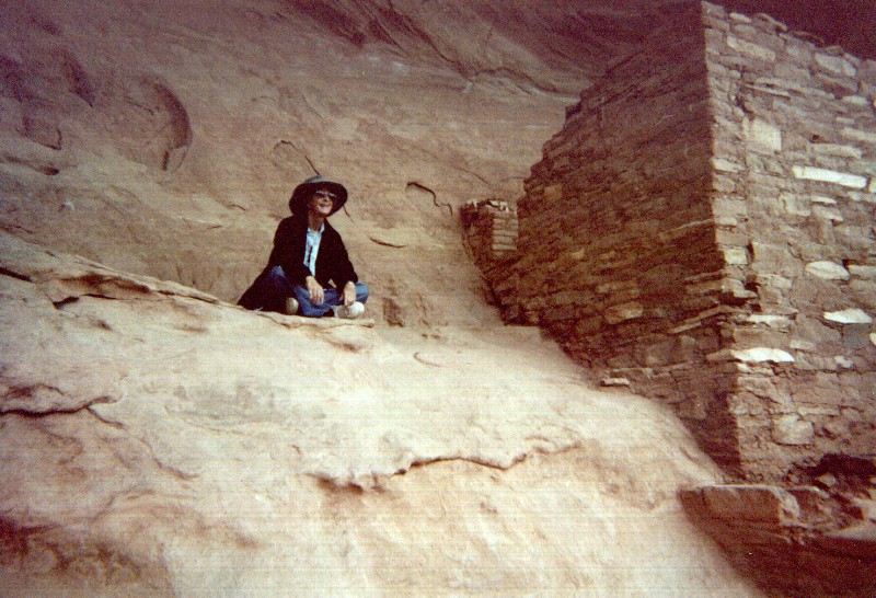 Other sites can be viewed at close range. This is a shot of Louise enjoying the same great view the Anasazi had from this particular dwelling. Click on the image for an expanded view. |