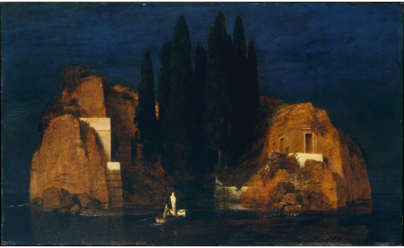 Böcklin disliked titling his works as a matter of principle. He felt that paintings should evoke a mood in the viewer, and evidently thought that attaching a title would interfere with this objective. In this belief he was probably correct, as a title certainly seems to predispose one to experience a work in a particular way. However, our more prosaic minds seem to require labels. One famous example of this is Beethoven's Piano Sonata in c sharp minor, which was given a more descriptive name by a music critic named Rellstab. Thereafter the artist's violent motion of spirit, poured into music, was reduced to a critic's quiet impression of moonlight on water in the minds of countless listeners. By the same token, the title The Isle of the Dead is the invention of an art dealer named Fritz Gurlitt, who perhaps realized (correctly), with a merchant's keen and deadly intuition, that one can not market an artwork without giving it a name.